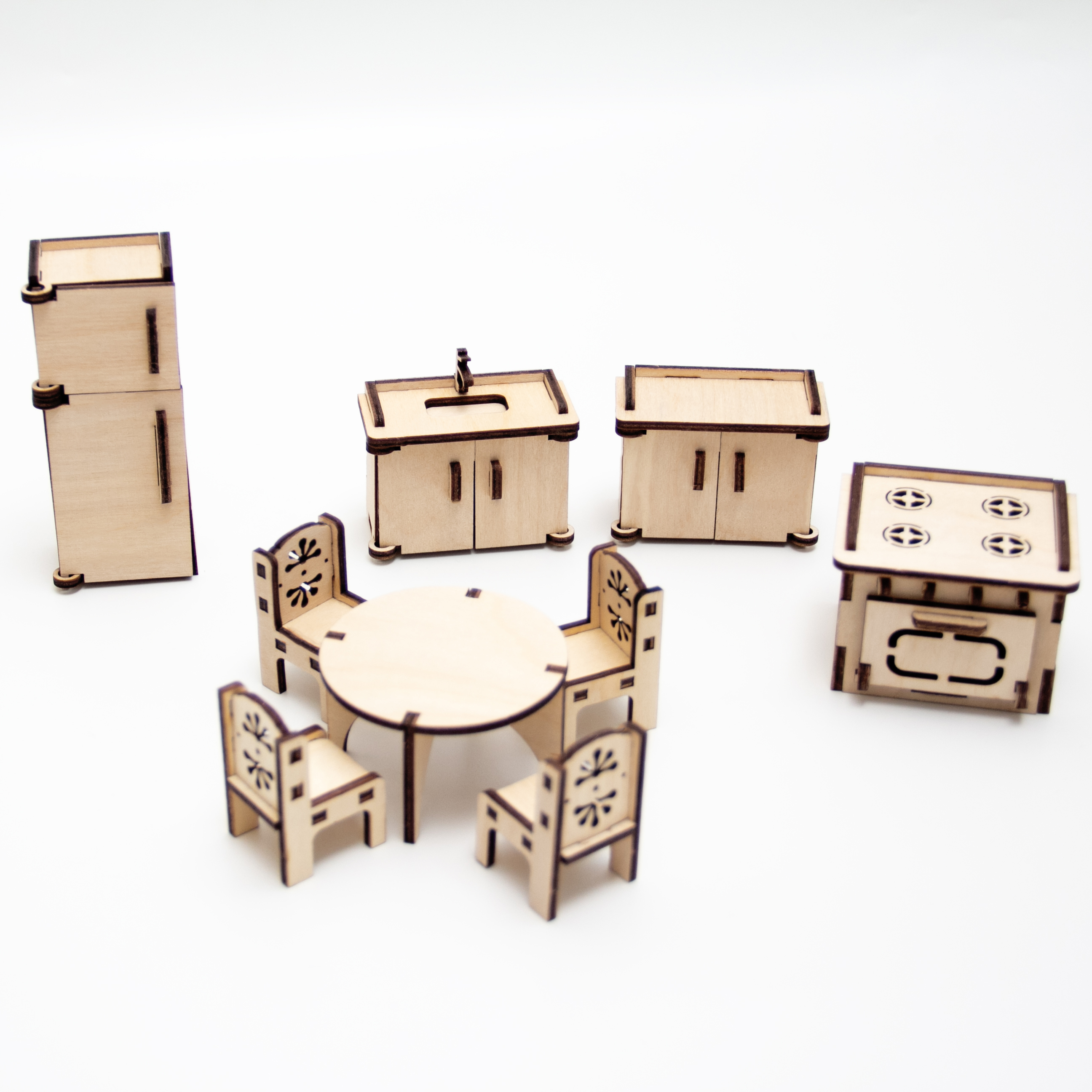 Игрушка изготовлена из дерева – экологически чистого и гиполаллергенного материала. Предназначена для детей от 3 лет. Набор мебели ‘’кухня’’ создан специально для одной из комнат кукольного домика. Упаковочная коробочка выполнена из древесно-волокнистой плиты высокой плотности. Мебель выполнена из высококачественной березовой фанеры, даже небольшие элементы, такие как ручки на дверцах. Все детали собираются с небольшим количеством клея, просто вставляются в пазы, крепление очень прочное и надежное. Набор кукольной мебели выполнен максимально реалистично – вся мебель имеет открывающиеся двери. Внутри тумбочек и шкафов есть полки. В этом наборе представлено максимальное количество предметов, чтобы дети могли играть долго и придумывать свои сценарии игры. Эти игрушки созданы с любовью и вниманием к вашим детям, пусть они играют с удовольствием и с воображением, развивают дизайнерский и художественный потенциал, обустраивая собственный домик.