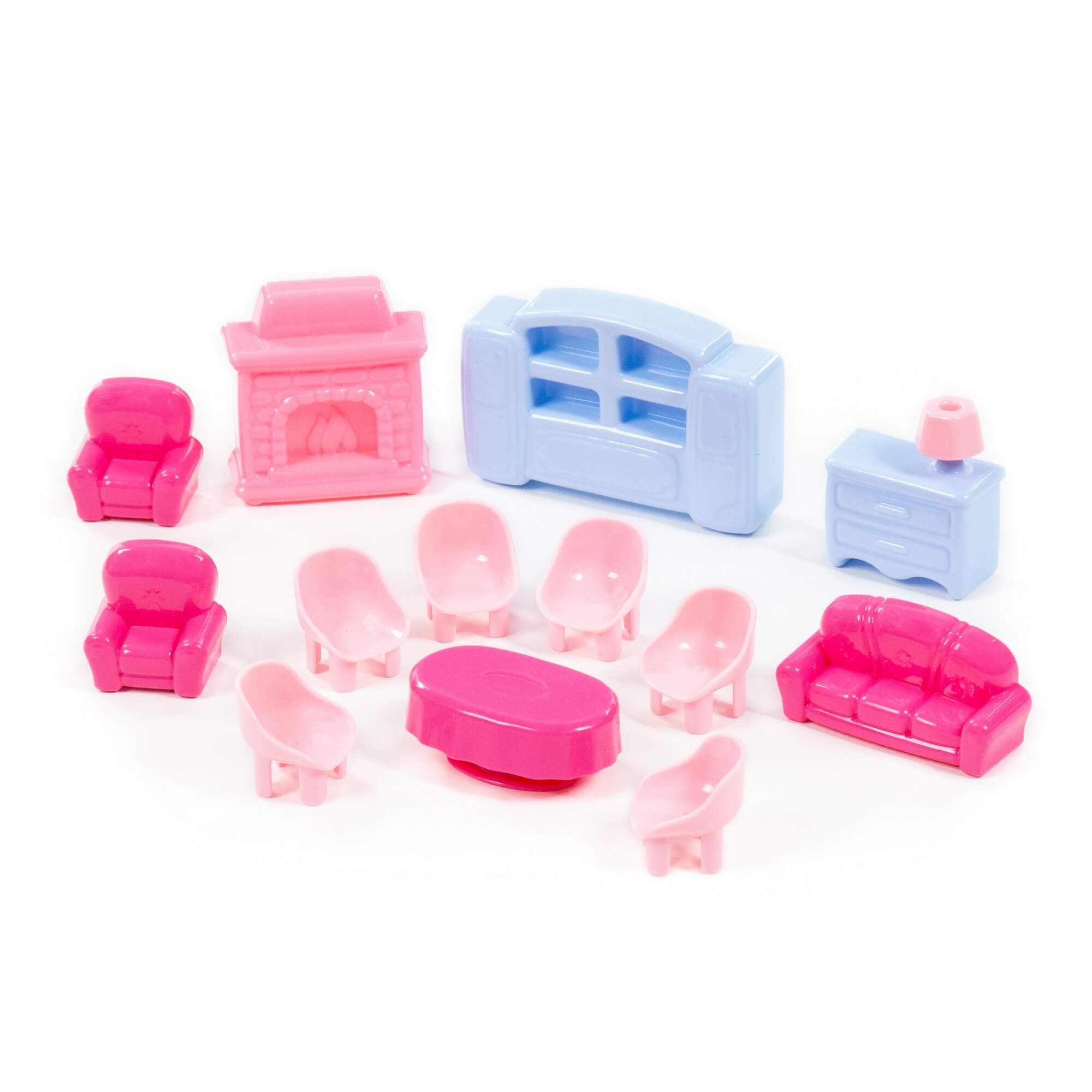Набор мебели для кукол позволит обустроить интерьер игрушечного жилья. Проявляя фантазию и воображение ребенок учится формировать собственную модель поведения в условиях реальной жизни. В набор входит: диван, 2 кресла, обеденный стол, 6 стульев, сервант, комод, камин и тумбочка со светильником.