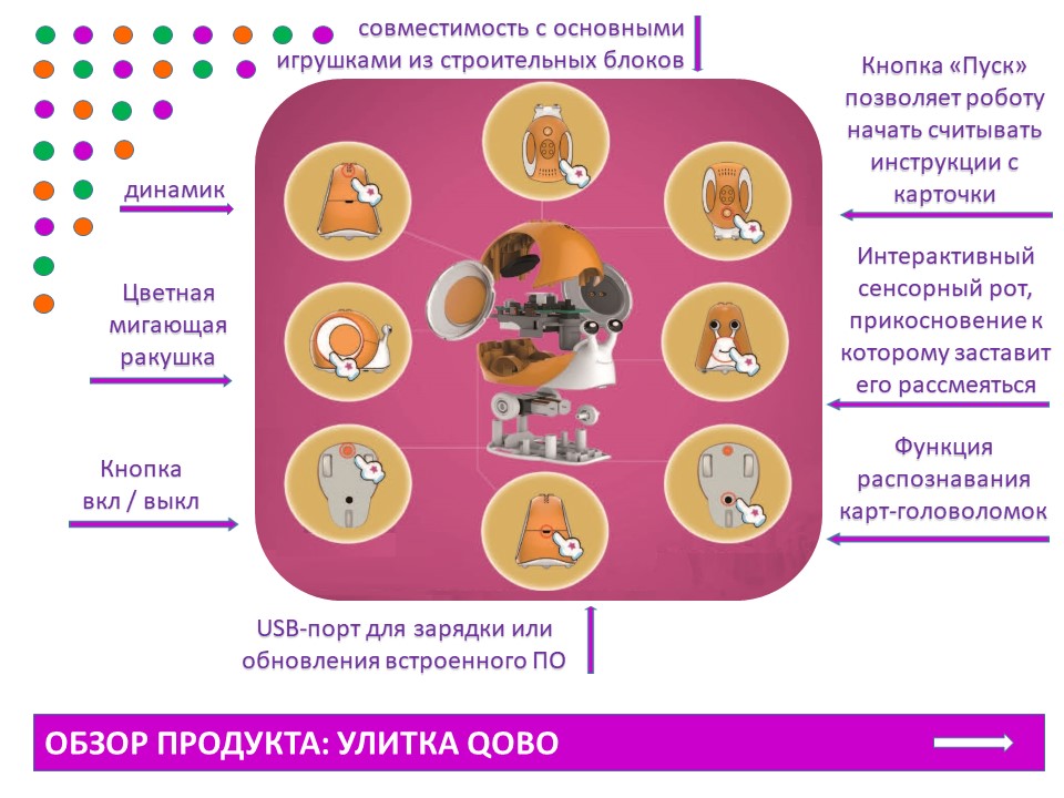 Робот-улитка считывает в нужной последовательности программные карты, которые подносят к датчику распознавания команд. После чего, на любой ровной поверхности Qobo выполняет программу движения самостоятельно.
