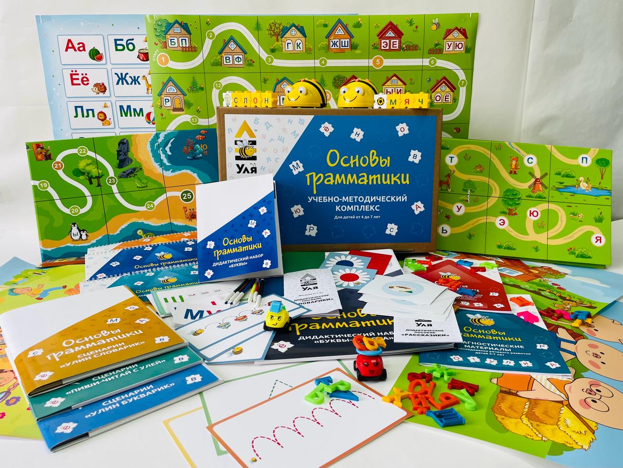 Полный набор необходимого игрового оборудования и учебно-наглядных пособий, включая мини-роботы Bee-Bot, образовательные конструкторы Morphun® «WORDPHUN ПРОслова» Русский язык 306 деталей, «Мои первые слова».