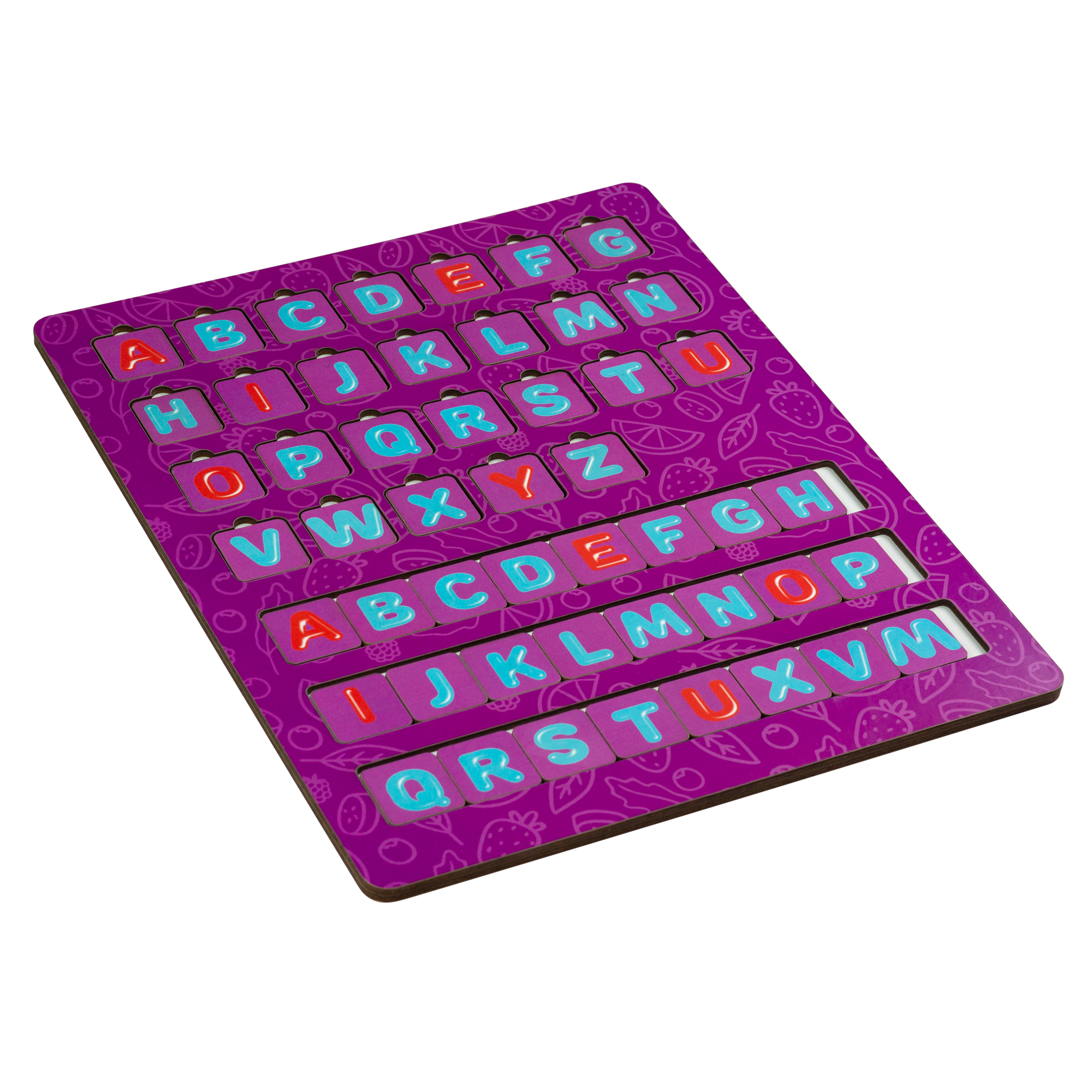 Как играть? Складывать буквы в определенные рамки. Попросите малыша найти каждой букве свою картинку — домик. Важно! Обязательно проговаривайте не только буквы, а еще и картинки к каждой букве, названия растений на английском языке. Данный дидактический материал будет вам очень полезен, если вы не только будете называть ребенку букву, но и обратите внимание, что, например — слово Apple (яблоко) начинается на букву A. А на какую букву заканчивается это слово? Такие упражнения хорошо тренируют слуховое внимание, и дети хорошо запоминают английские слова.