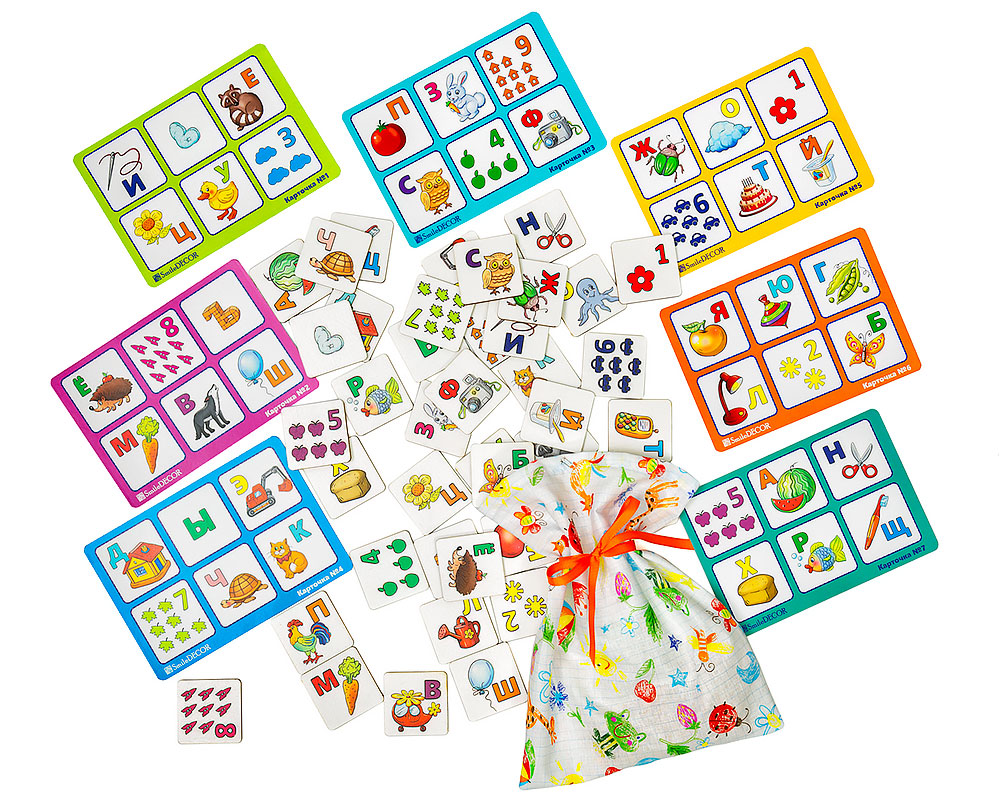 2. Игра «Лото». Выберите карточку для каждого игрока, спрячьте все фишки в мешочек. Ведущий вытягивает по одной фишке из мешочка, называя букву или цифру. Игрок, у которого на карточке есть такая же буква или цифра, забирает фишку и закрывает соответствующее «окошко».
