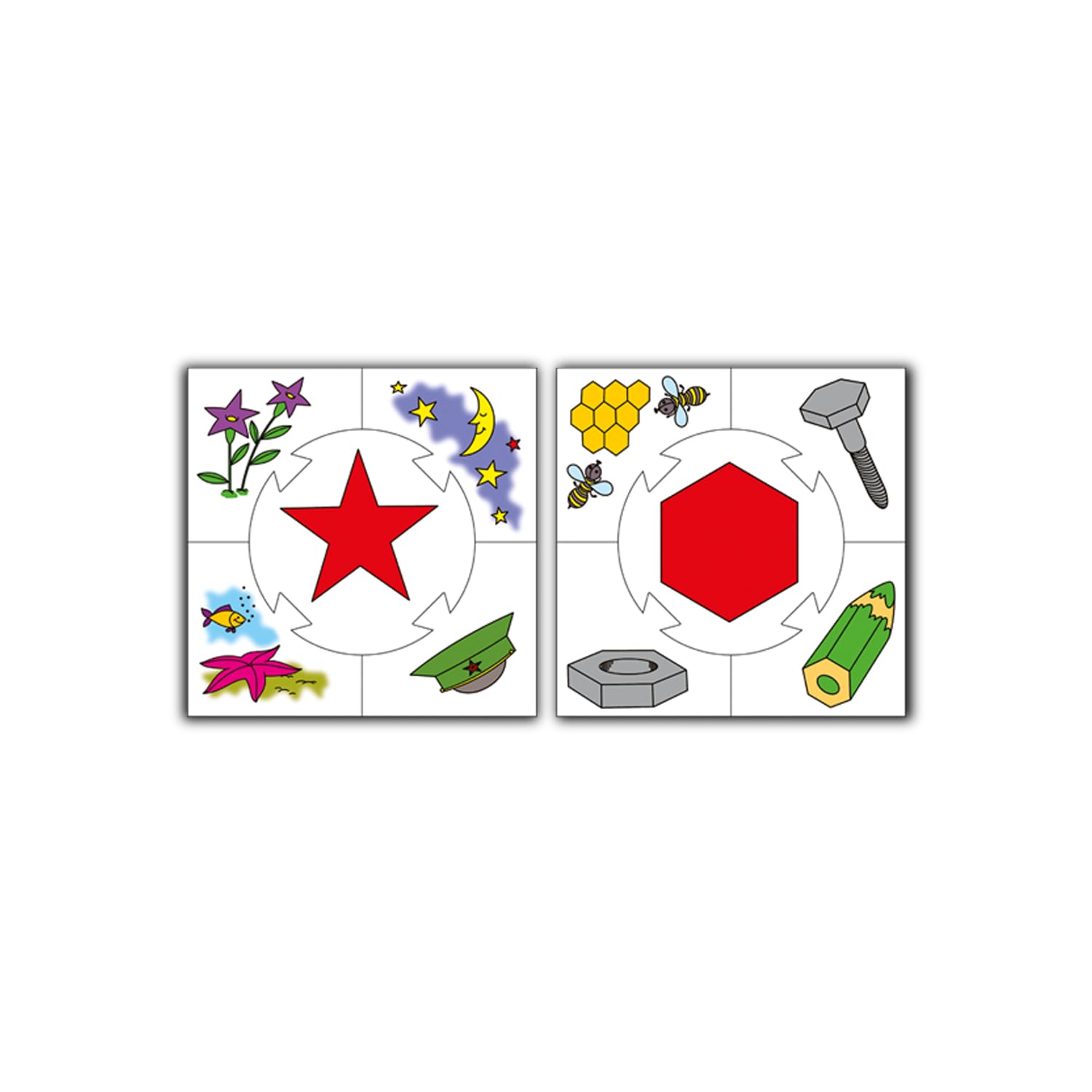 Настольная игра «Фигуры» (серия «Учись, играя!»). Состав: круглые карточки – 10 шт., карточки – 40 шт. Материал: бумага, картон. Для детей от 3 лет. Тренирует наблюдательность, внимание и мелкую моторику пальцев рук, развивает образное мышление, знакомит с формами и названиями 10 простых геометрических фигур.