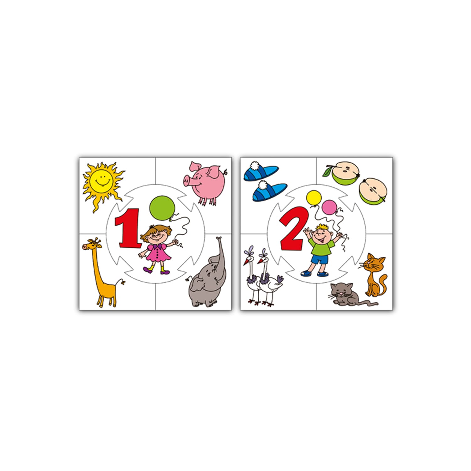 Настольная игра «Цифры» (серия «Учись, играя!»). Состав: круглые карточки – 10 шт., карточки – 40 шт. Материал: бумага, картон. Для детей от 3 лет. Тренирует наблюдательность, внимание и мелкую моторику пальцев рук, развивает образное мышление, знакомит с цифрами от 1 до 10, учит сопоставлять цифру с количеством объектов на картинке.