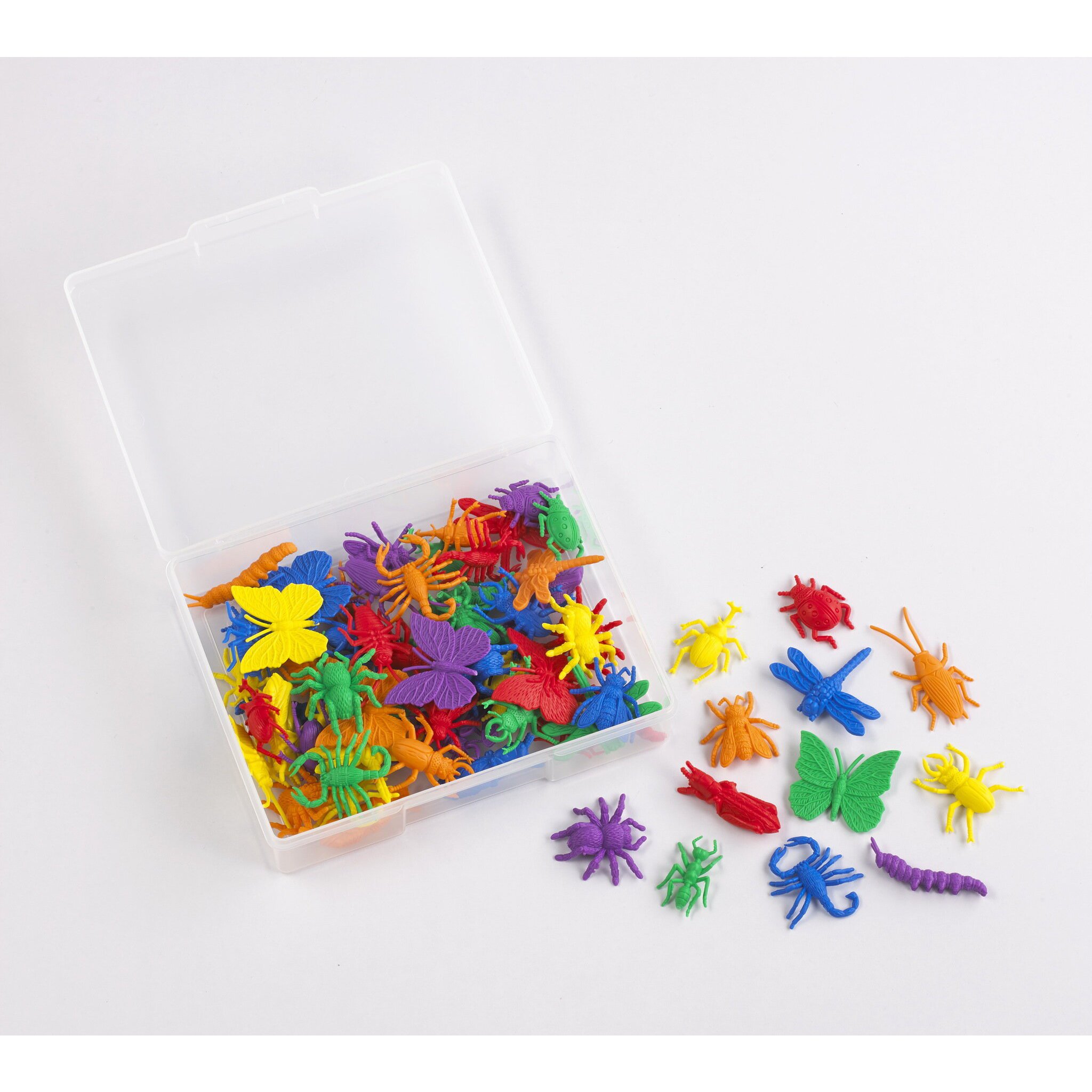 В наборе 72 фигурки насекомых, 6 ярких цветов. Фигурки представлены в виде: муравья, бабочки, гусеницы, таракана, стрекозы, мухи, божьей коровки, саранчи, жука носорога, скорпиона, паука и жука-оленя. Средний размер фигурки составляет 4,5х4,3 см (бабочка). Все детали упакованы в удобный контейнер. Подробнее