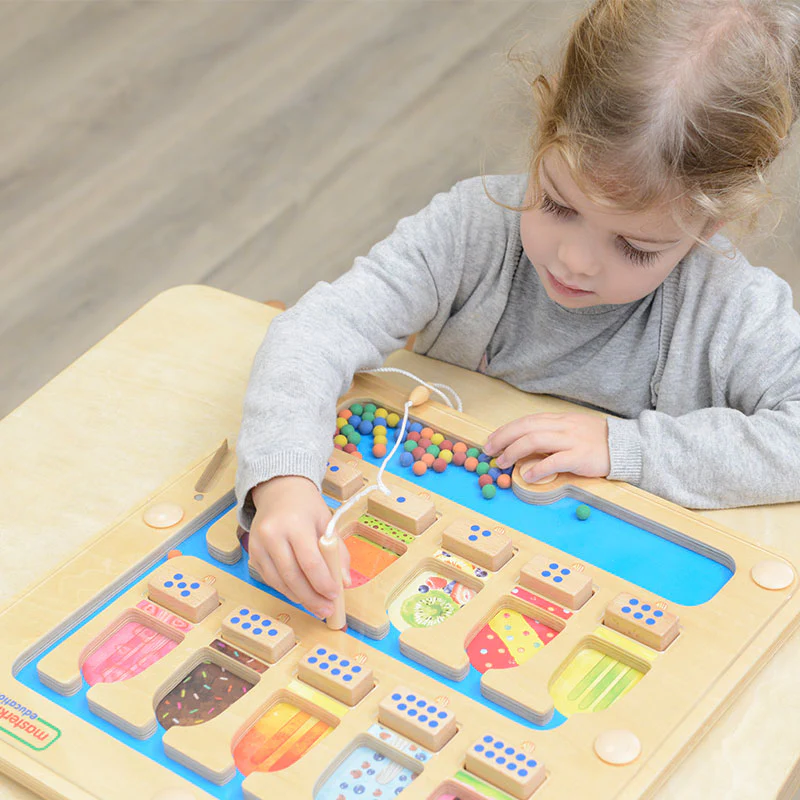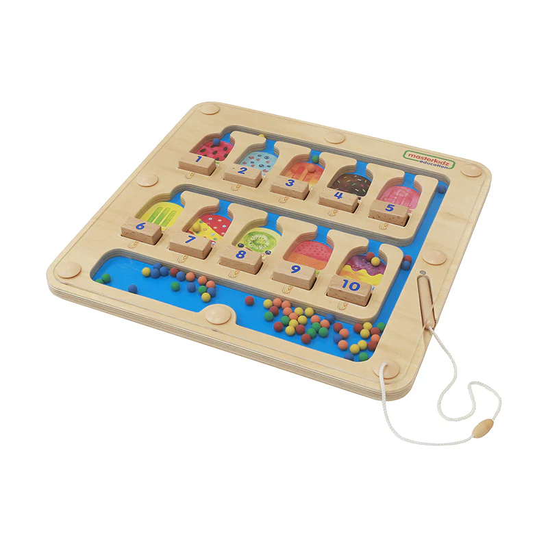 Панель представлена в виде магнитного лабиринта, на котором изображено 10 разноцветных эскимо. Используя магнитную ручку, необходимо разместить количество шариков соответствующему эскимо: по цифре или количеству точек.