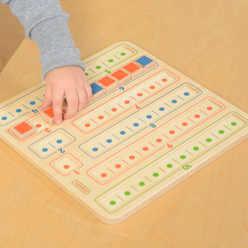Основание панели выполнено из березовой фанеры, на которой слева представлены 5 пронумерованных и отмеченных цветными точками линий-выемок для раскладки фишек, справа расположены фишки в синем и красном цветах. Панель учит складывать простые числа от 1 до 10.