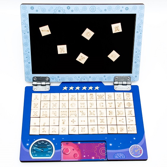 Деревянная панель с магнитными фишками и фишки с буквами, буквы повторяются для множества вариантов слов, фишки с цифрами и математическими знаками. Магнитный монитор.