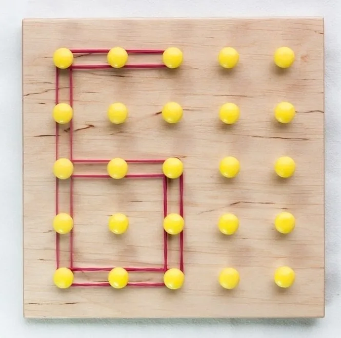 Представляет собой деревянную панель, на которой расположены 25 крючков-держателей. Во время занятий с пособием дети узнают, какие фигуры можно построить с помощью цветной резинки, а также как это сделать. Также у ребёнка будет возможность придумать свой собственный узор. Пособие направлено на развитие сенсорики и мелкой моторики у детей, развитие творческого мышления и фантазии. Можно проводить как индивидуальные, так и групповые занятия.