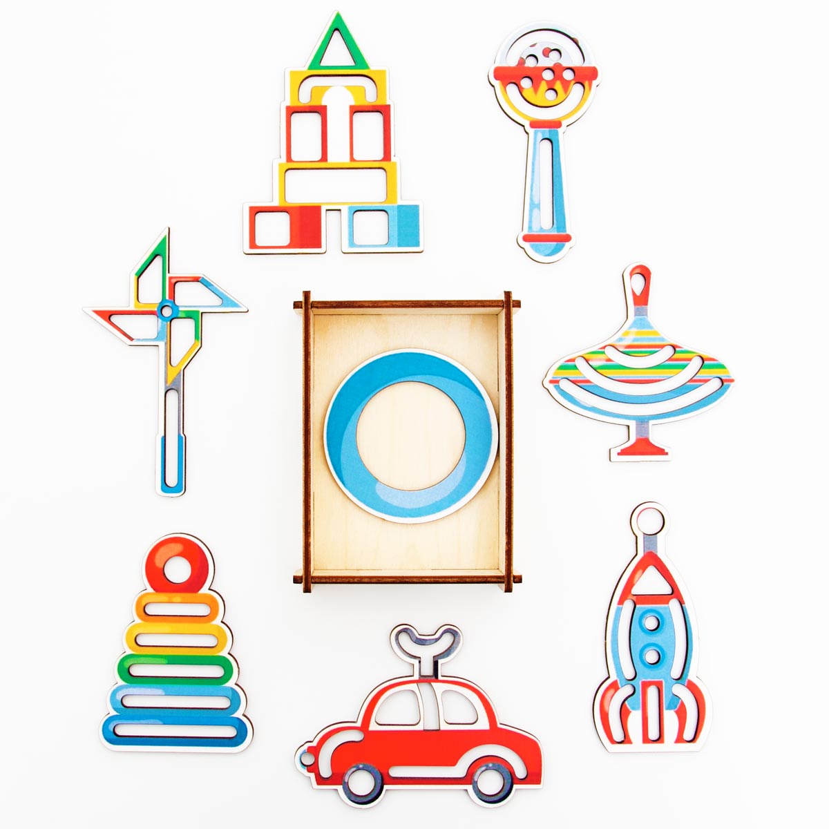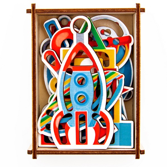 Набор трафаретов и деревянной коробочки для их хранения. Коробочку можно дополнительно использовать как материал для игры, разбирать и складывать обратно, развивая логику и мелкую моторику. В наборе присутствуют детали-игрушки: ракета, машина, мяч, погремушка, юла, две пирамидки разных видов, вертушка.
