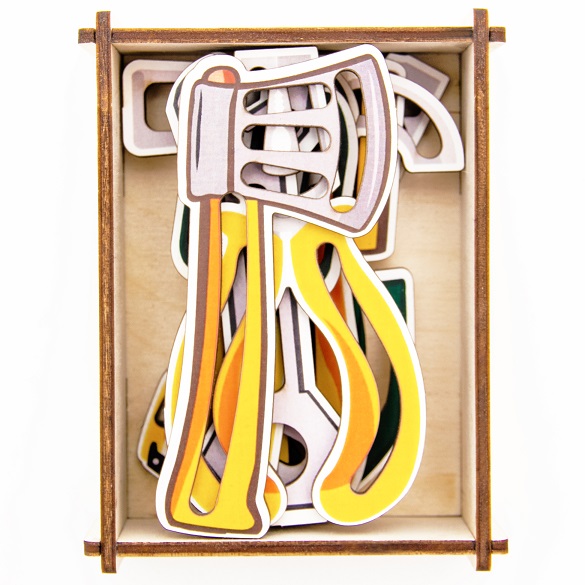 Набор трафаретов и деревянной коробочки для их хранения. Коробочку можно дополнительно использовать как материал для игры, разбирать и складывать обратно, развивая логику и мелкую моторику. В наборе присутствуют детали: пила, топор, плоскогубцы, молоток, два гаечных ключа разных видов, лопата и грабли.
