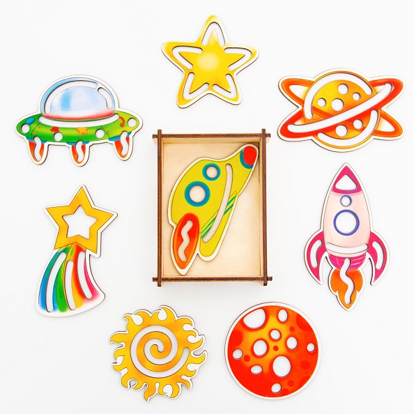 Набор трафаретов и деревянной коробочки для их хранения. Коробочку можно дополнительно использовать как материал для игры, разбирать и складывать обратно, развивая логику и мелкую моторику. В наборе присутствуют детали: звезда, комета, планета Сатурн, планета Марс, Солнце, ракета, летающая тарелка НЛО и космический самолёт.