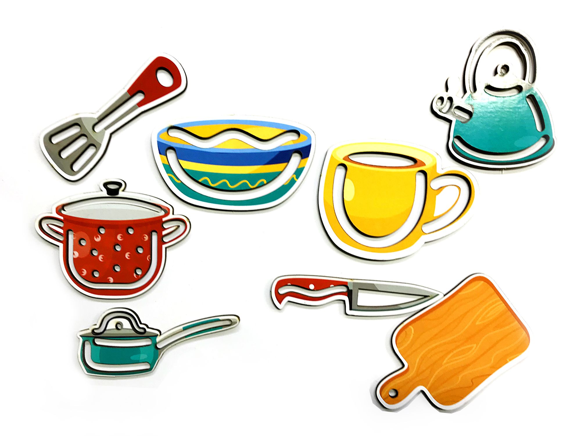 4. Игра Что есть у нас на кухне? Предложите ребёнку вместе найти все предметы изображенные на трафаретах на своей кухне. Можно обсудить для чего они нужны, а так же рассказать, что можно брать самостоятельно, а что нет (нож острый, чайник горячий и т.д.).