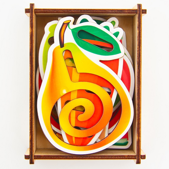 фрукты: груша, аннуровка с контурами фигурок для шнуровки, шнурком и самими фигурками. Контуры усложняют задачу, необходимо не просто прикрепить с помощью специального шнура на основу фигурки, (большого слона, маленького слона, большую бабочку, маленькую бабочку), но и правильно соотнести эти фигурки с контурами. Здесь хорошо тренируются сенсорные эталоны. Ребенок должен правильно положить все фигурки на их контуры и прикрепить шнуром к панели.
