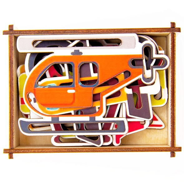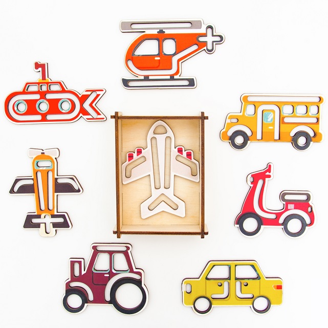 Набор трафаретов и деревянной коробочки для их хранения. Коробочку можно дополнительно использовать как материал для игры, разбирать и складывать обратно, развивая логику и мелкую моторику. В наборе присутствуют детали: трактор, самолёт двух разных моделей, автобус, автомобиль, мотоцикл, вертолёт, подводная лодка.