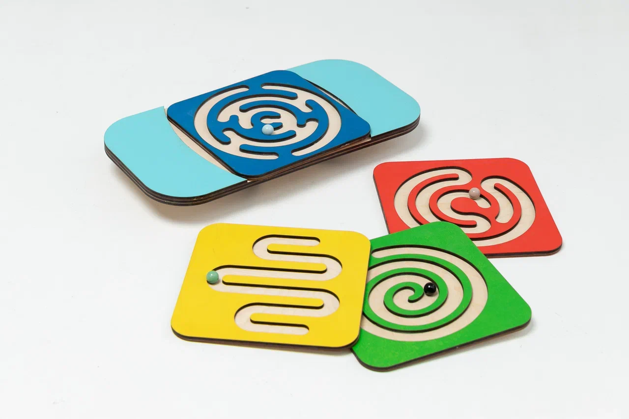 В комплекте: доска-балансир; 4 сменных диска-лабиринта; 4 шарика из закаленного стекла. Упакованы в короб с крышкой.