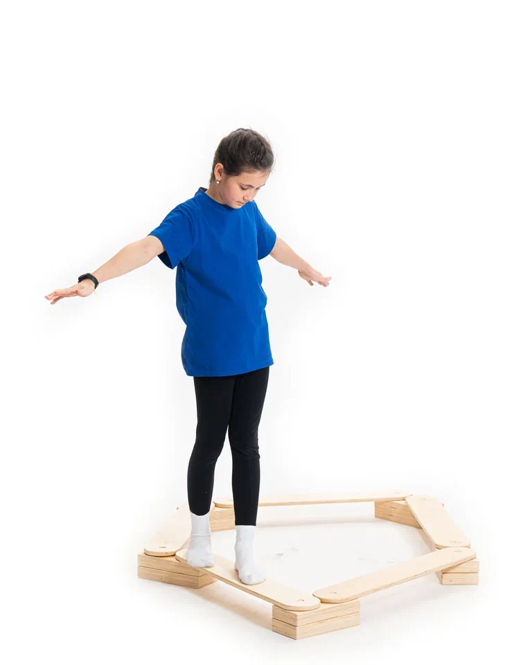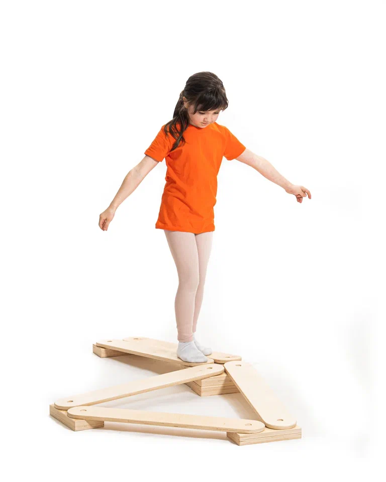 В комплекте 10 опорных элементов высотой 4 см (могут вставляться один в другой) + 5 досочек-мостиков (12х75 см). Вставляя опоры одну в другую можно увеличить высоту дорожки или создать «горку» с меньшей высоты на большую.