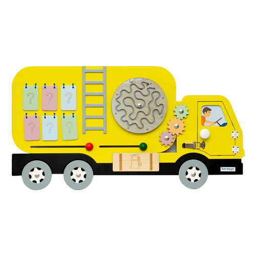 Бизиборд в виде бензовоза с большим лабиринтом и карточками-мемори. Мы разработали его для самостоятельных игр или занятий с педагогом специально для детей 3-7 лет.