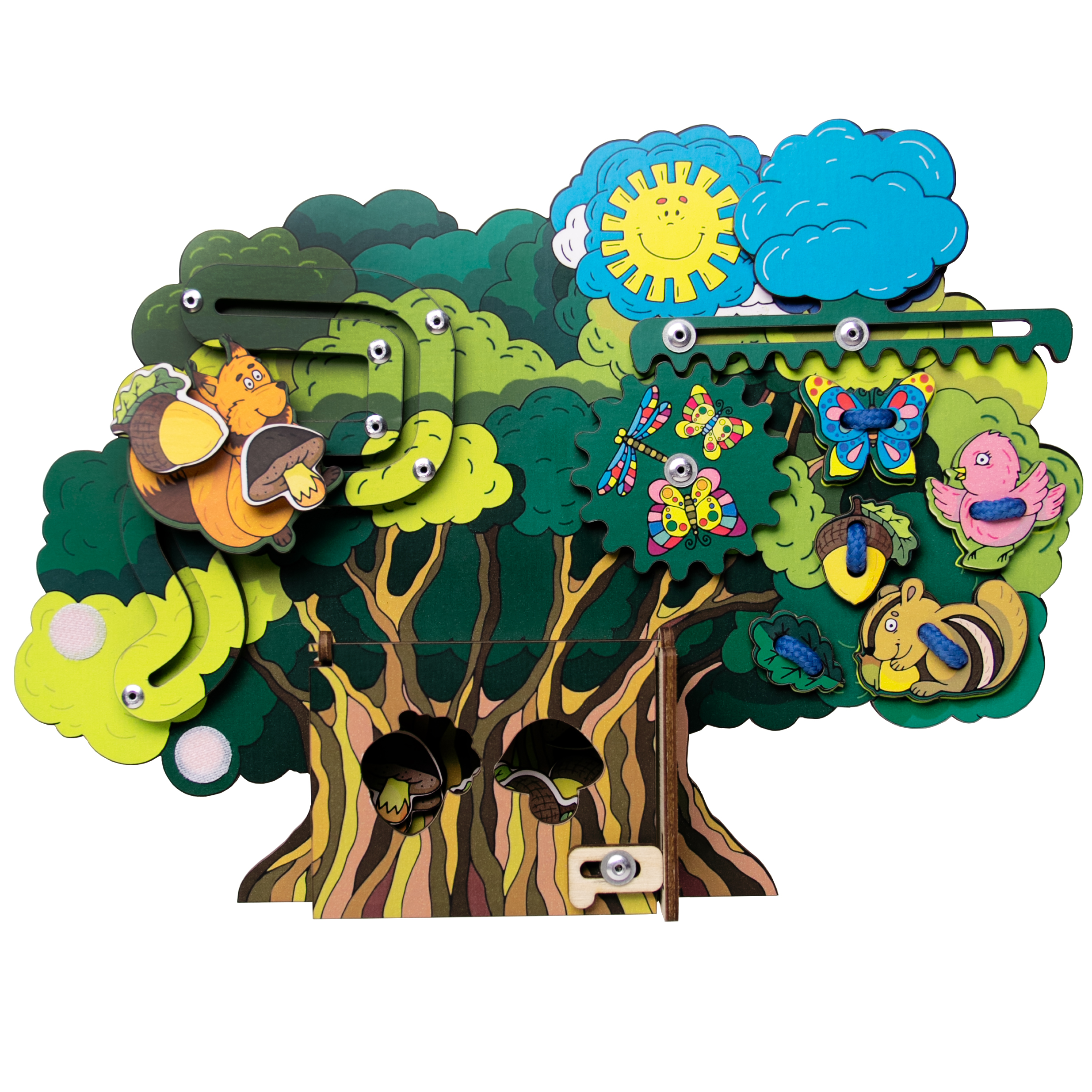На панели находятся: лабиринт с двигающейся белочкой. Белочка имеет липы, чтобы прикладывать грибочки и желуди на липах. Так же на панели прикреплен ящичек для хранения грибочков и желудей на липах. Ящичек с крышкой, у которой есть отверстия в форме грибочка и желудя для сортировки. Ящичек можно закрывать на задвижку.