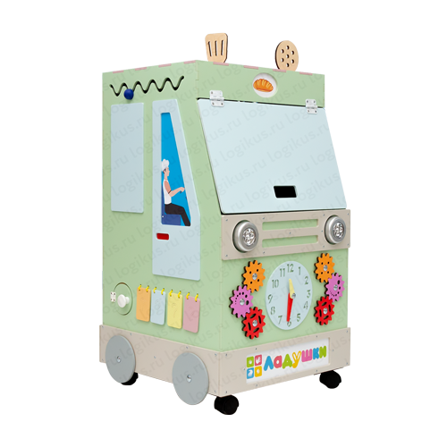 На объемном бизиборде есть все традиционные развивающие элементы: шестеренки, часы, карточки-мемори, разные лабиринты. На крыше у фургончика — плита и поварские принадлежности.