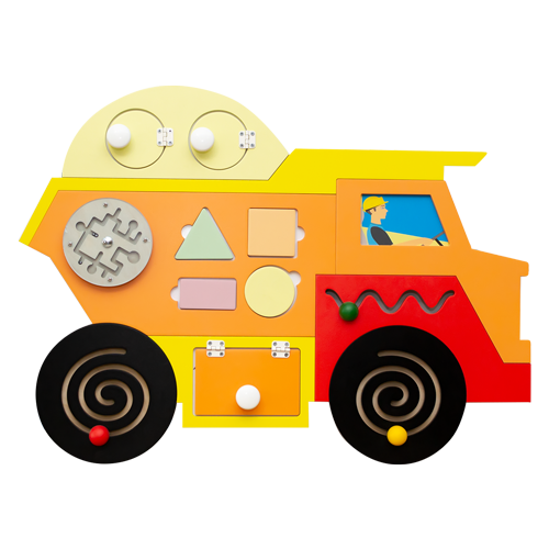 Этот бизиборд для маленьких строителей — яркий и вместительный грузовик. Добавлены геометрические фигуры для изучения формы и цвета.