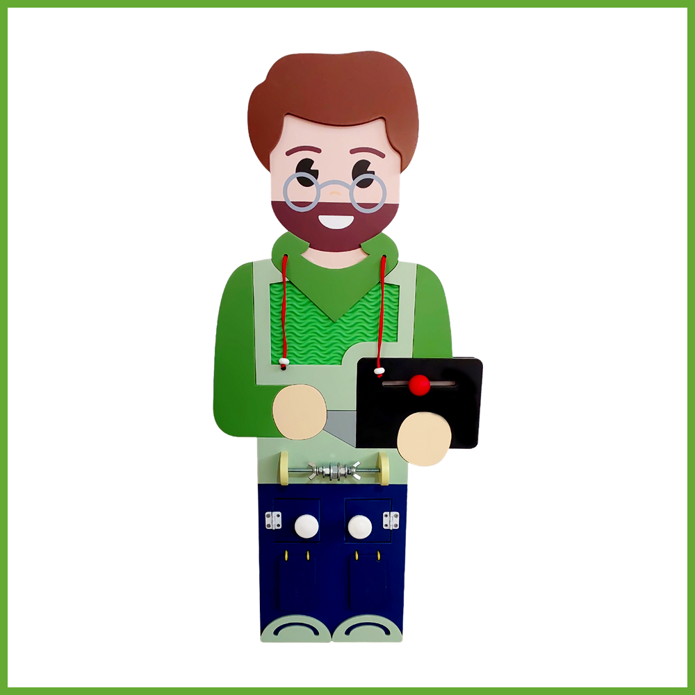 Бизиборд для оформления стен детского сада. Предназначен для первого знакомства дошкольников с самой актуальной профессией программиста. Элементы для развития мелкой моторики рук привлекают детей младшего возраста и удерживают внимание на теме.