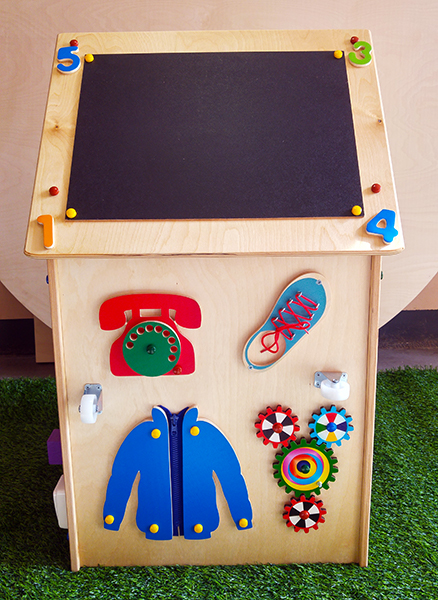Развивающий домик-бизиборд для детских садов и прочих образовательных учреждений. Каждая сторона предназначена для развития различных навыков. Пригоден для использования детьми с ограниченными возможностями здоровья.