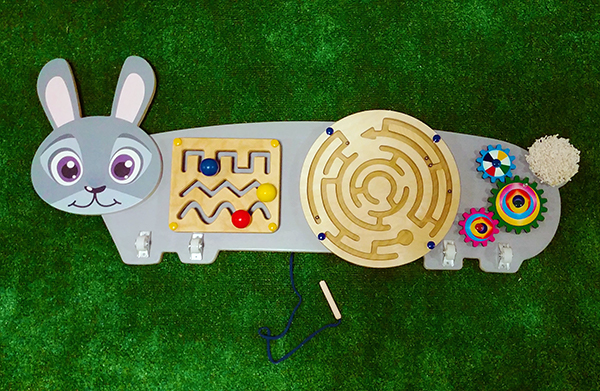 Бизиборд для детского сада. На панели расположены развивающие элементы по различным направлениям (мелкая моторика, тактильное восприятие, память, концентрация и т.д.).