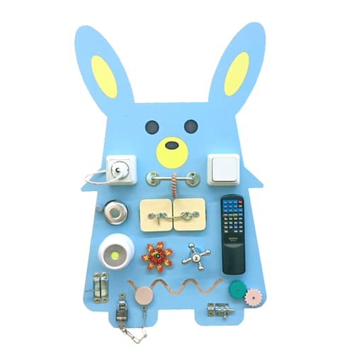 Развивающие элементы: вилка с розеткой, выключатель, открывающиеся дверцы, звонок, пульт, кран водопроводный, спинер, элемент "движение по прорези", шестеренки, различные замочки, лампа