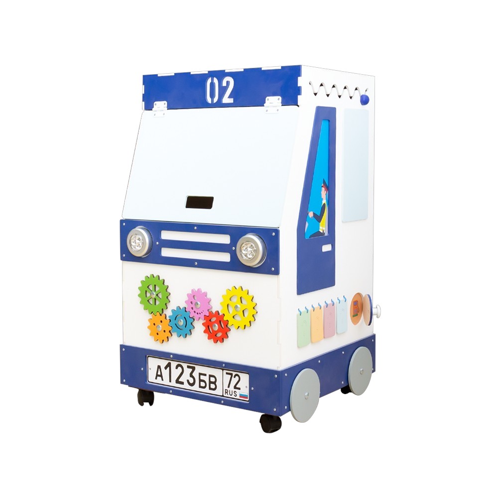 На объемном бизиборде есть все традиционные развивающие элементы: шестеренки, руль, карточки-мемори. На крыше у машинки – лабиринт со знаками дорожного движения.