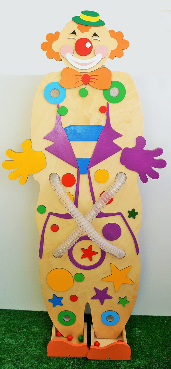 Панель из высококачественной фанеры с объемными элементами, окрашенных безопасной ВД краской. На клоуне размещены 2 гибких прозрачных лабиринта по которым запускаются шарики. Панель отлично подойдет и в качестве декоративной.