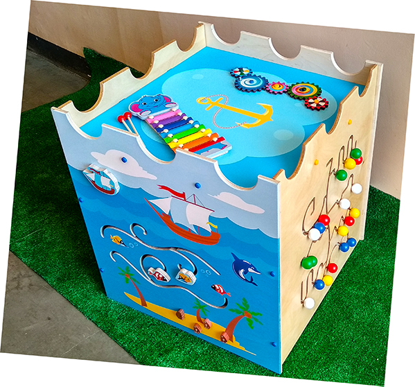 Напольный куб для одновременной игры. Каждая сторона представляет собой развивающую игровую панель. Выполнен в морской тематике с нанесенными при помощи УФ печати изображениями. Красочный дидактический куб для украшения любой группы детского сада или игровой комнаты.