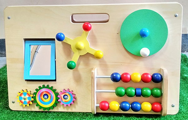 Треугольная настольная панель с двумя игровыми поверхностями. На каждой из которых размещены развивающие игровые элементы. Выполнено из шлифованой фанеры. покрыто экологически чистым бесцветным лаком. Все детали покрашены безопасной для детей ВД краской. Вращающиеся барабаны, вращающееся зеркало, счеты, шестеренки. и т.д.
