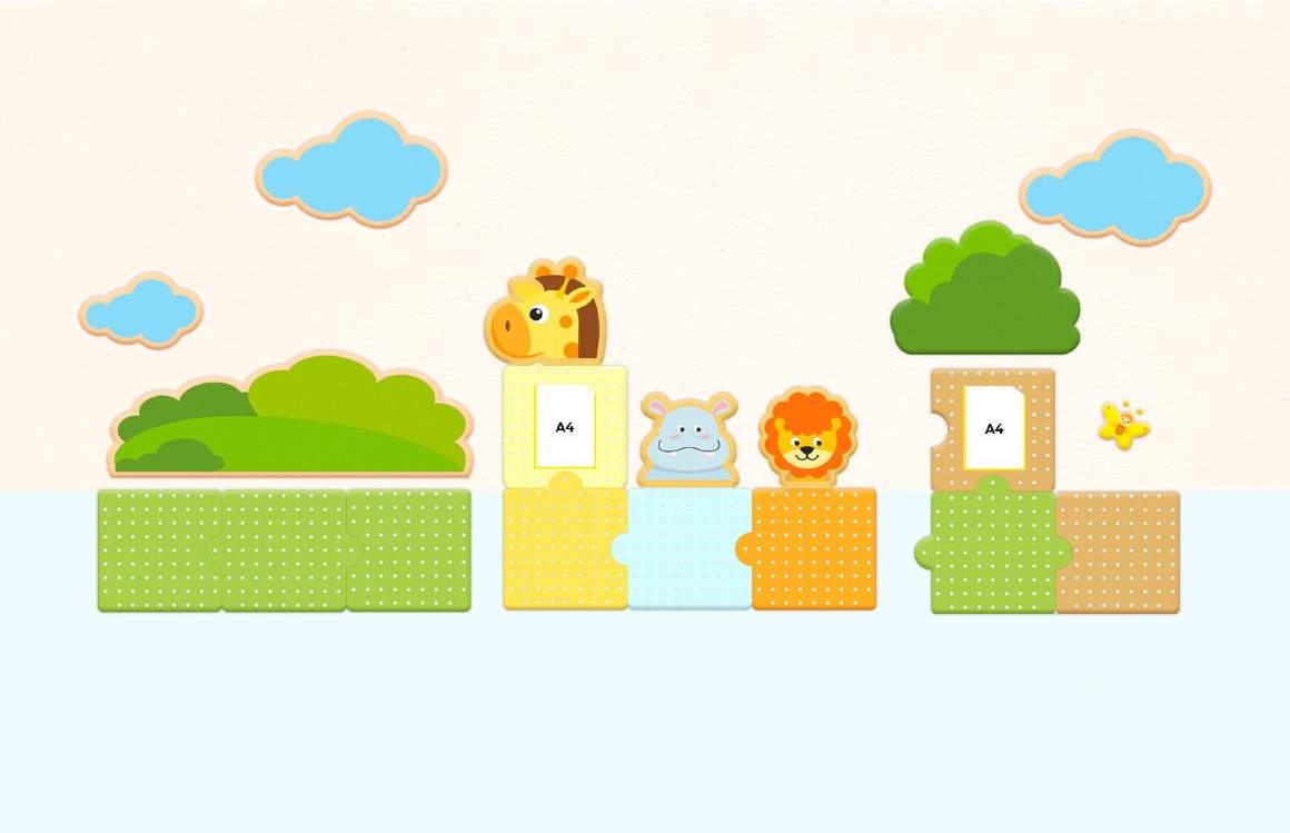 Комплектация : панели "Пазл" - 10 шт, декор : жираф, бегемот, лев, бабочка, кустик, луг, тучка малая - по 1 шт, тучки большие -2 шт, карманы А4 - 2шт.
