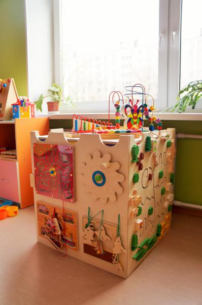 Развивающий куб выполнен из дерева, на каждой грани находятся различные развивающие элементы. Можно играть одновременно с каждой стороны.