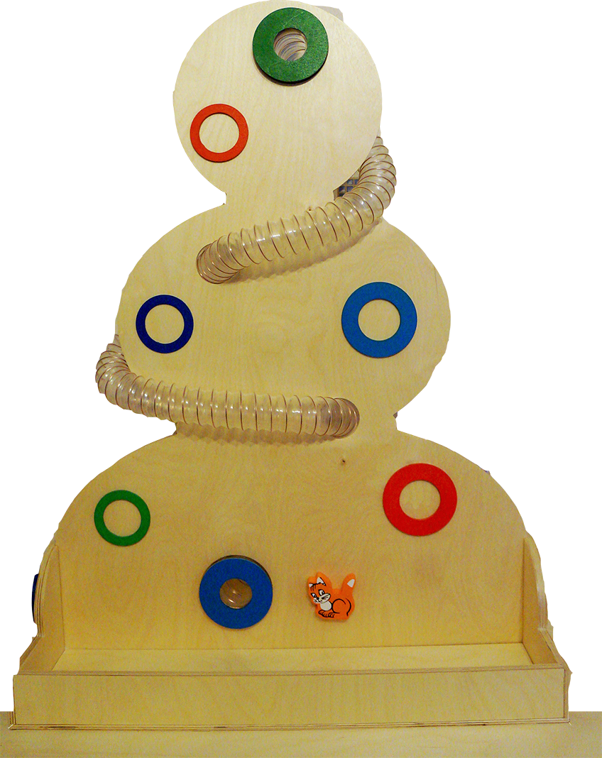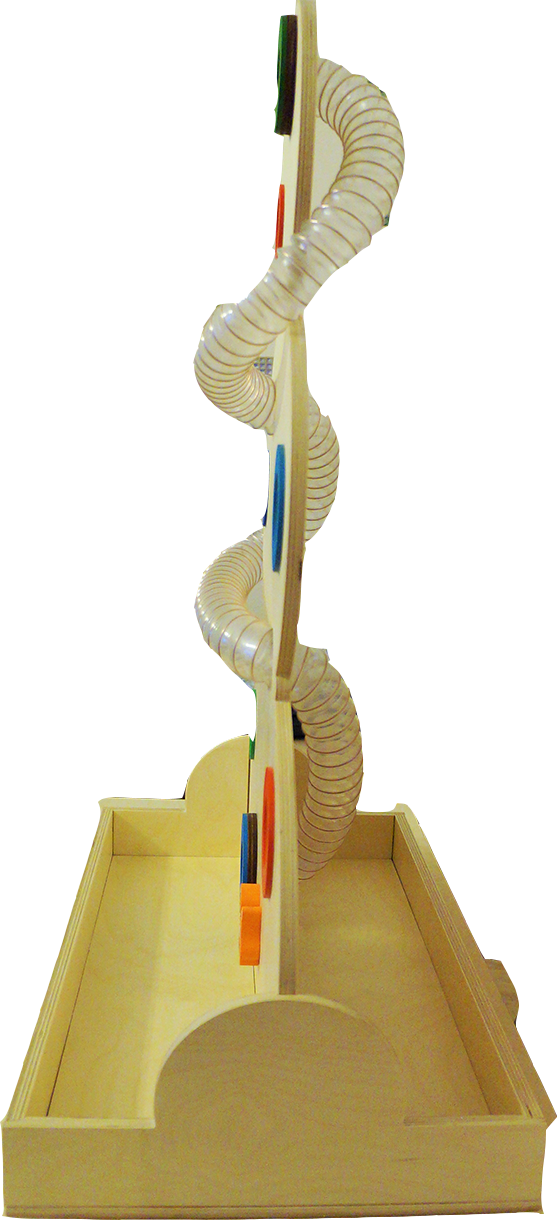 Вертикальный лабиринт напольный деревянный. По прозрачным желобам запускаются шарики, которые описывают несколько оборотов вокруг фигуры.