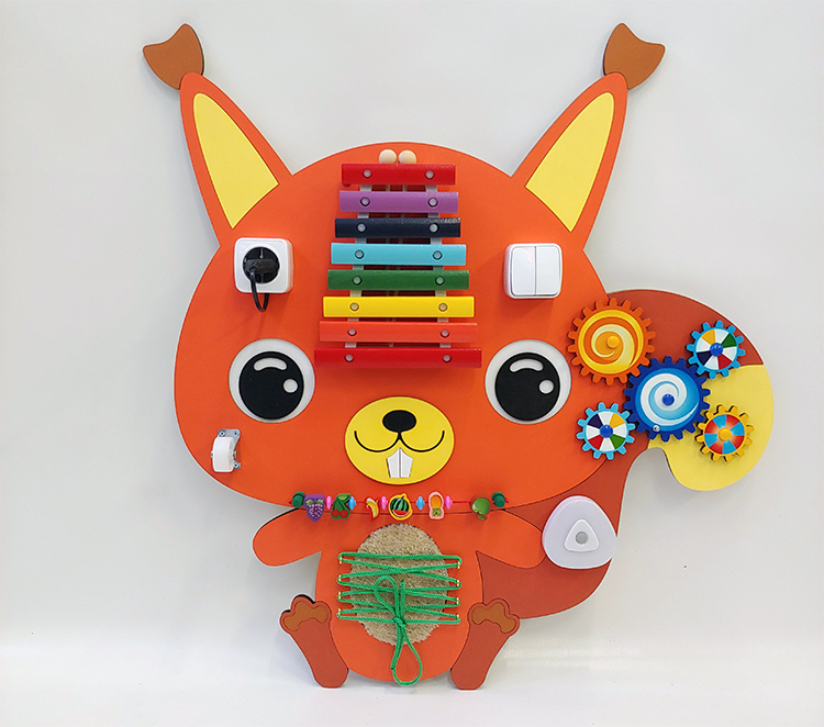 Дидактическая панель Белка. Включает в себя металлофон, сортер, шнуровку, тактильную вставку из шерсти, светильник, вращающиеся шестерни, ролики. Элементы туловища накладные, многослойные для создания объемной фигуры.