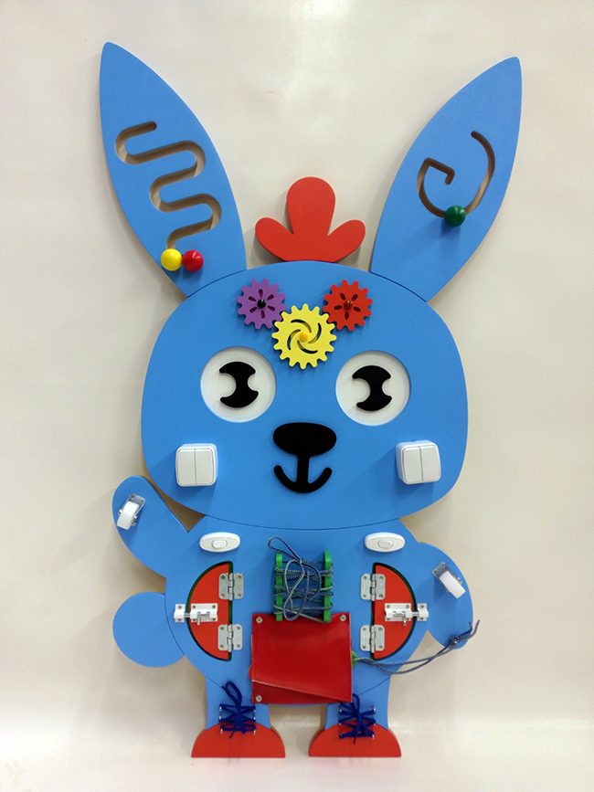 Заяц 650х650х30 мм., 3 шестеренки с прорезями, 2 лабиринта движение по прорези различных форм, ролики, полукруглые дверцы, карман на липучке, морковь на веревке, шнуровки в нижней части.