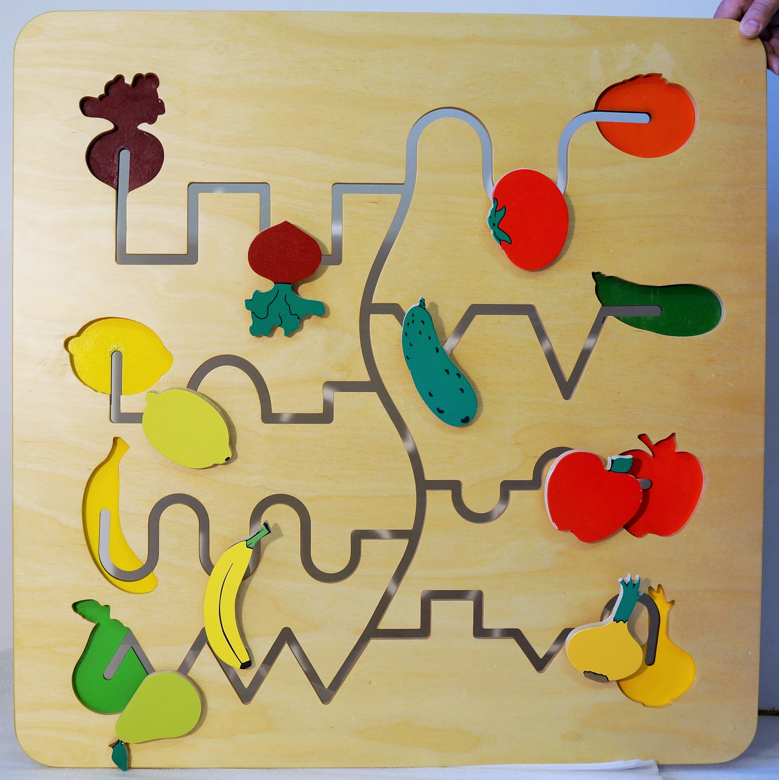 Объемные изображения фруктов движутся по пазам и встают на свои места. Банан, груша, яблоко, помидор, лимон, редька, огурец.