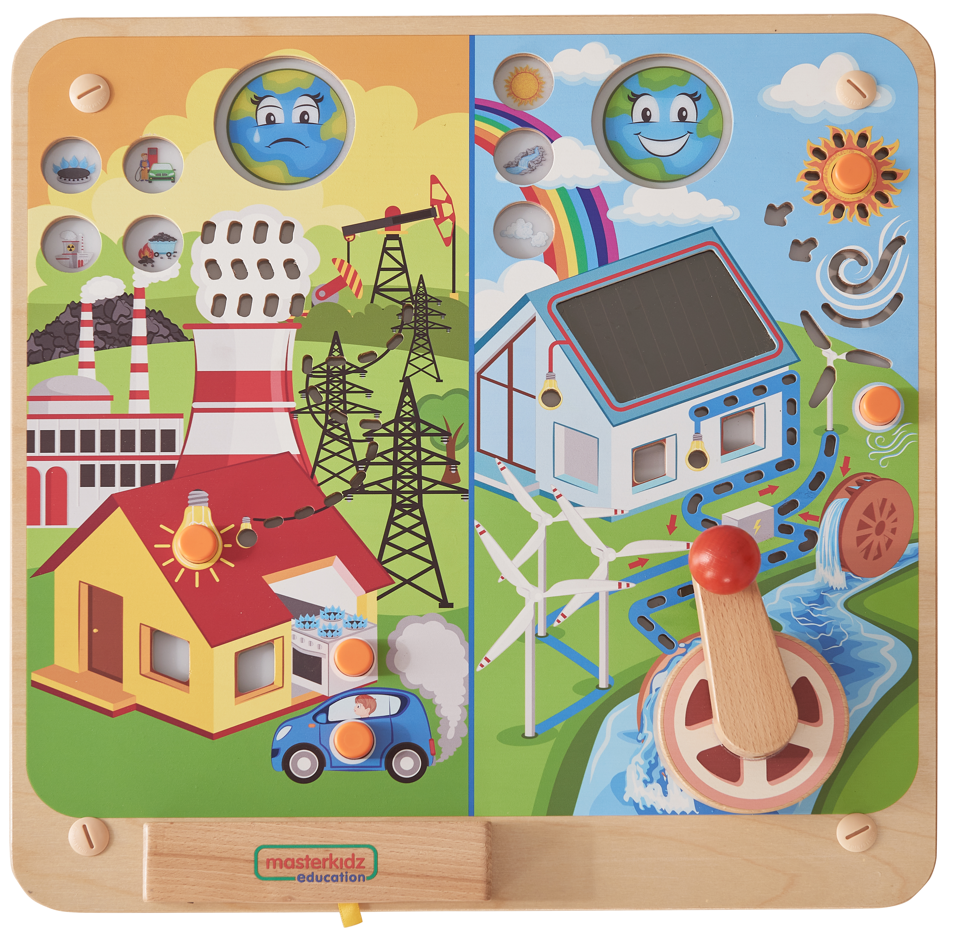 Панель разделена на 2 части. Левая сторона -несчастная земля, потребляющая невозобновляемые ресурасы. Правая сторона-счастливая земля, использующая возобновляемую энергию. Используются световые эффекты: на крыше дома установлена солнечная панель, освещающая свет в доме; а ручной гидрогенаратор помогает детям увидеть как потоки воды генерируют энергию. Размеры: 460мм*460мм*85мм.