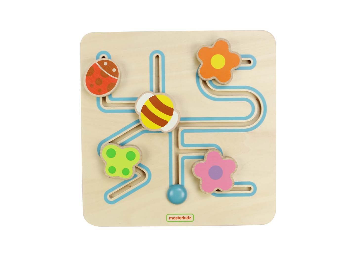 На панели расположен скользящий лабиринт, в котором зафиксированы бегунки в форме насекомых, выполнен из экологически чистого европейского бука. Подходит для тренировки мелкой моторики. Размеры: 28*28*2см.