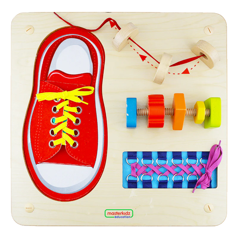Панель выполнена из березовой фанеры. На лицевой поверхности панели выполнено углубление, в котором зафиксирован макет обуви со шнурком для изучения различных методов шнуровки. В верхней правой части расположены выступы в форме полукруга в кол-ве 3 шт., ниже на выступах расположен шкив с резьбой, на котором перемещаются 3 фигуры разных форм. В нижнем правом углу расположено углубление, в котором вмонтированы металлические кольца в кол-ве 12 штук, через которые продевается шнурок для изучения различных методов шнуровки.
