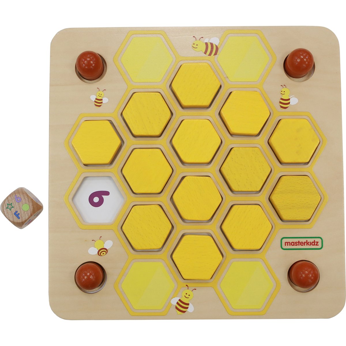 Панель из березовой фанеры выполнена в виде пчелиной соты, состоящей из шестиугольных ячеек. По краям панели расположены колышки, на которые нанизываются карточки с заданиями. Каждая из карточек представлена в различных темах: цифры, буквы на английском языке, геометрические формы, цвета. Размеры панели 280мм*280мм
