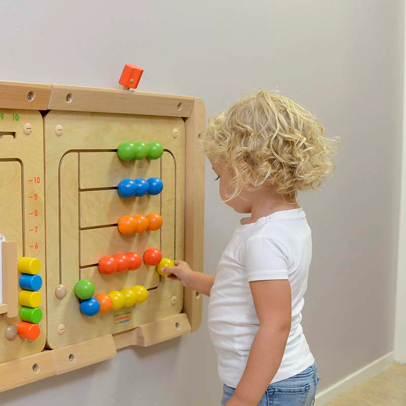 Настенная панель выполнена из березовой фанеры, на лицевой части выполнены прорези в виде лабиринта, в которых подвижно закреплены шарика различного цвета. Панель содержит детали 6 цветов, по 4 детали каждого цвета. По углам панели размещены отверстия для крепления к СТЕМ стене при помощи направляющих (в комплект не входят).