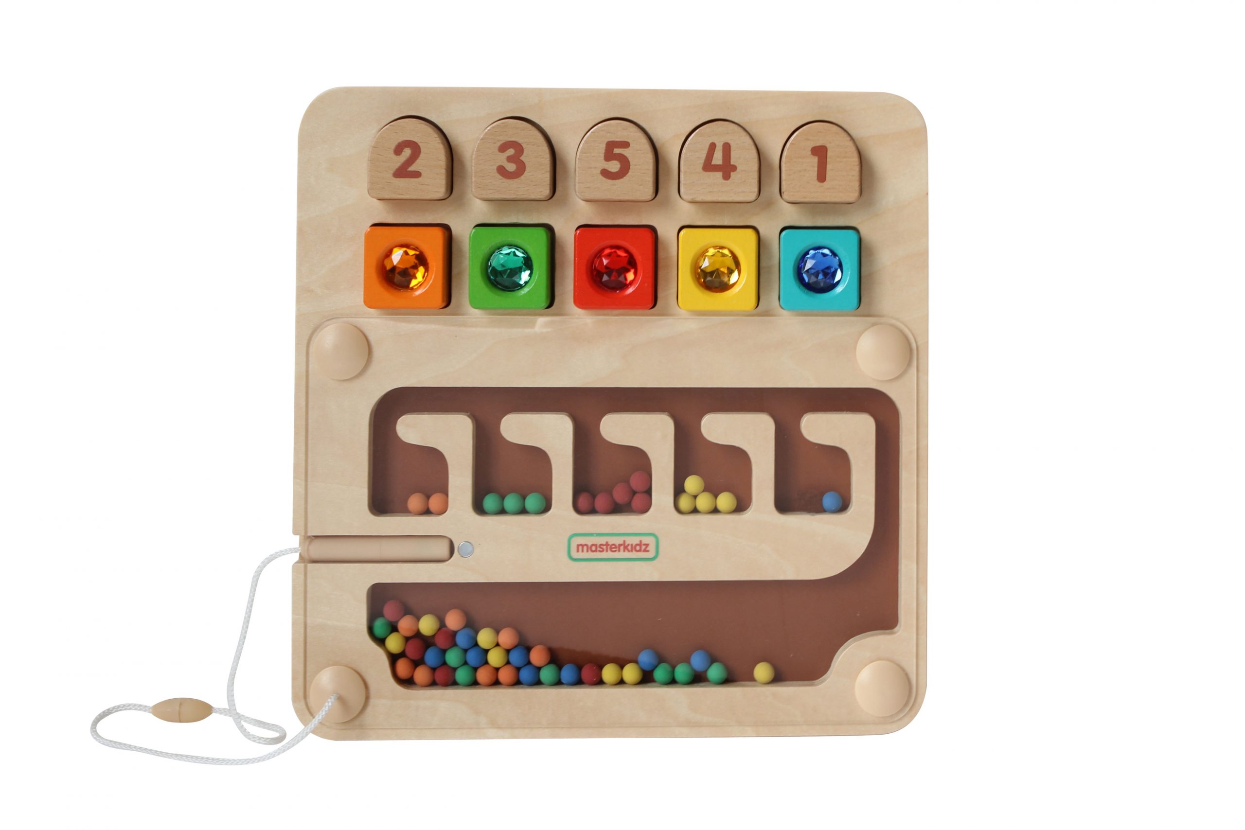 В верхней части панели расположены блоки с цифрами и цветными камешками, в нижней части лабиринт с разноцветными шариками и магнитной палочкой. Панель-лабиринт предназначена для обучения счету от 1 до 5, изучения цвета и развития координации и мелкой моторики.