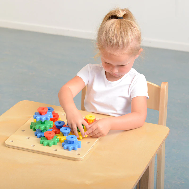 На поверхности панели имеются отверстия с набором шестеренок и болтиков. Ребенок, используя воображение, может создавать различные конструкции (шестеренки можно укладывать многослойно).