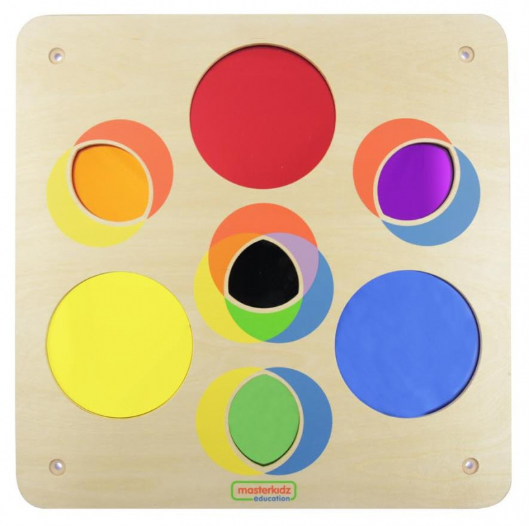 - 3 круглых углубления и 3 лепестковых углубления, в которые вмонтирована зеркальная пленка в 3-х цветах. По центру панели углубление, в которое вмонтирована зеркальная пленка черного цвета, получаемого в результате смешивания 3 цветов.