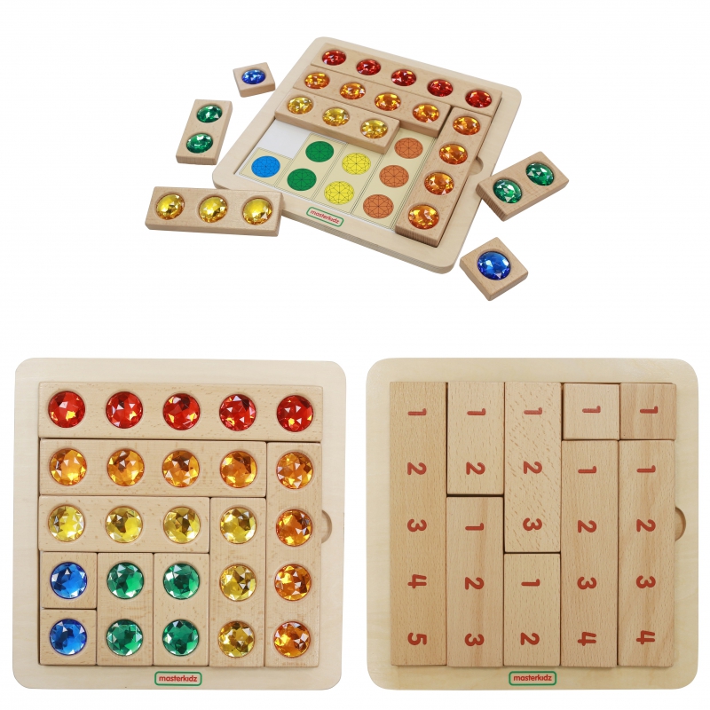 Основание панели выполнено из березовой фанеры, на которой расположен набор из 5 счетных слитков, изготовленных из бука, инкрустированных красочными акриловыми "драгоценными" камнями в 5 цветах. Пособие предназначено для обучения счету от 1 до 5 и изучения цвета.