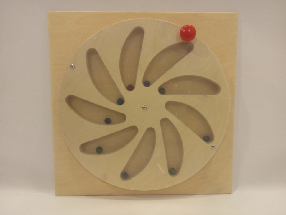 В центре расположено поле в виде каплевидных секторов с перекатывающимися шариками. При вращении панели шарики, пересыпаясь, создают звуковое сопровождение - шум дождя.