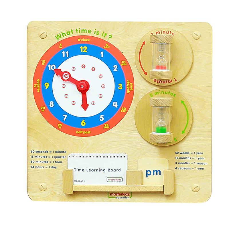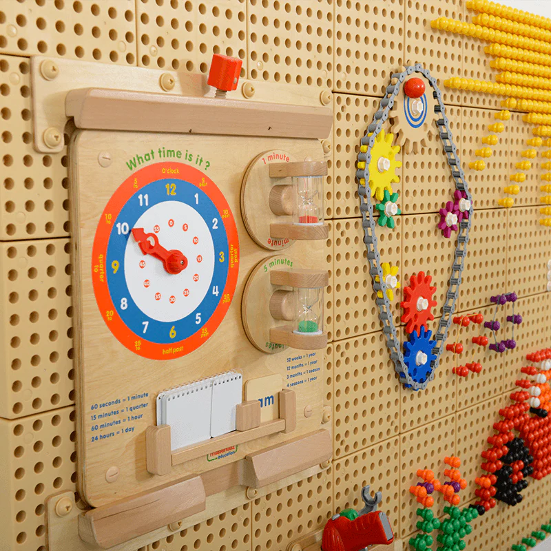 Интерактивная панель из березовой фанеры толщиной 18мм. В центре панели есть вращающиеся стрелки, показывают любое время, но при перемещении секундной стрелки часовая стрелка перемещается так же как на обычных часах. Для того что бы задать задачу можно использовать карточки. Также есть отдельный блок с изображениями утра и вечера, два таймера песка для отслеживания времени: 1 минута и 3 минуты.
